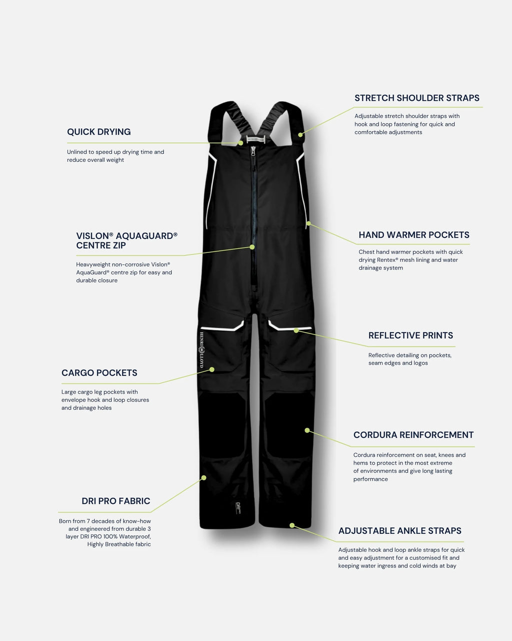 - 3-lags DRI PRO-stoffkonstruksjon med teipede sømmer og Cordura-forsterkning på setet, knærne og kantene for å beskytte i de mest ekstreme miljøene og gi langvarig ytelse.