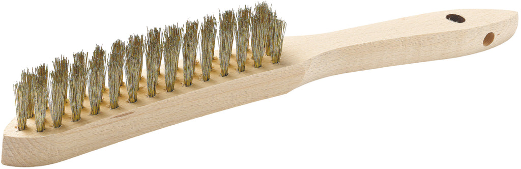 Klassisk stålbørste med svakt buet treskaft. Busten er laget i bølget, messingbelagt stål.